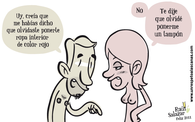 1. Recuerda llevar ropa interior de color rojo para poder tener una feliz vida sentimental en pareja. Aunque el de la viñeta de arriba hoy no folla. Y para el que celebre la despedida del año en una cena de gala, ir con la camiseta de la selección española tampoco garantiza que esa noche moje.