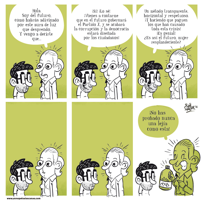 Así no. Bien saben los lectores de este blog qué defiendo y qué no. Y estas ridículas iniciativas faltas de argumentos hacen más daño del que pretenden mitigar. Basta ya de caretas de V de Vendetta si se quieren jugar a la política. Basta ya de frases hechas y pancartas cuando la guerra se quiere hacer desde dentro. Yo creo en la política, y la política tiene sus reglas. Que llevemos años viendo como esas normas son vilipendiadas sin compasión, no quiere decir que se deba renunciar a una forma tradicional de hacer política, aquella que originó las primeras democracias. Y para hacer política, lo primero que hay que hacer, partido del futuro, es dar la cara. Así tendrán mi confianza, mi apoyo, y sobre todo, mi ilusión.