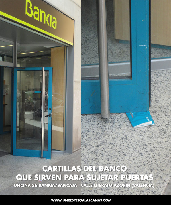 Nada más lejos de la realidad. Las cartillas estaban vacías y por lo visto, los empleados de esta oficina de BANKIA, no tenían otra cosa a mano para mantener abierta la puerta de entrada al banco.