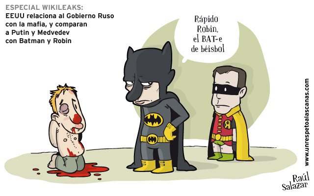 Lo que me ha hecho gracia es el cable que se ha filtrado sobre los roles de Putin y Medvedev (Primer Ministro y Presidente de Rusia respectivamente), quienes a ojos de Estados Unidos son, literalmente, «Batman y Robin» (no porque luchen contra el mal, sino por la relación subordinada de uno sobre el otro) en un «estado mafioso». (Noticia).