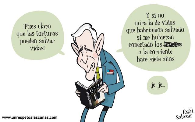 Nuestro Presidente Americano favorito (el de los dibujantes, digo), George W. Bush, ha escrito sus memorias (y mucha memoria no parece que tenga según algunas de sus declaraciones), dejando perlas como ésta, justificando las torturas, o asegurando que fue el único que se negaba a entrar en la guerra de Irak.