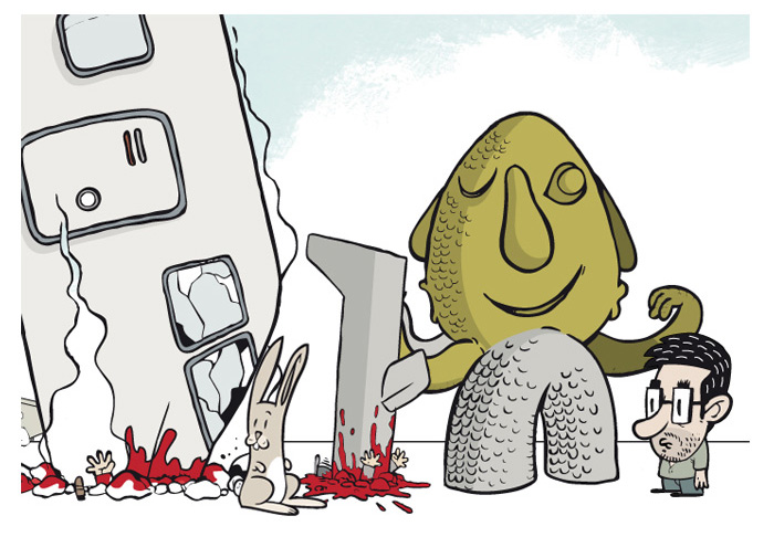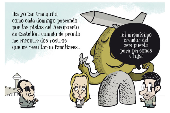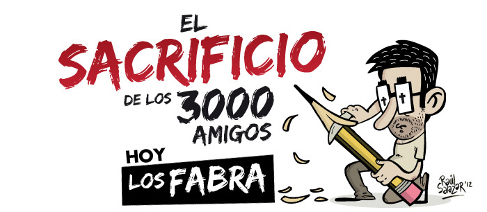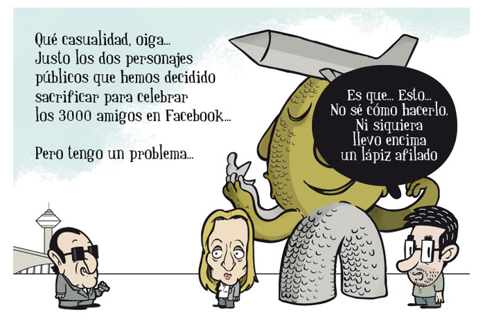 Ha llegado la hora. La semana pasado alcanzamos los 3000 amigos en nuestra página de facebook. Para celebrarlo decidimos realizar un sacrificio. El sacrificio de un personaje público, condenado a viñeta. Las votaciones se realizaron a través de la propia página de facebook, donde la cosa no estuvo muy discutida. Los Fabra, Andrea, su padre, y el aeropuerto para personas invadido por los conejos, arrasaron y he aquí el resultado.
