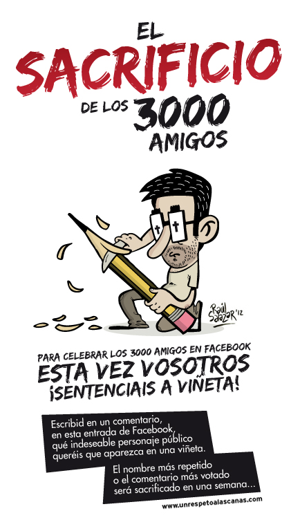 El mecanismo para elegir quién será el personaje sacrificado para celebrar estos 3000 amigos en facebook es sencillo. En la misma publicación de la página de facebook donde aparece la imagen conmemorativa [AQUÍ] (o sea, el canoso afilando un lápiz), podéis escribir comentarios con el nombre del personaje público que, según vuestra opinión, por indeseable, merece salir en una viñeta. El nombre más repetido o el comentario más votado, será el elegido en el plazo de una semana y nombrado protagonista de una viñeta.