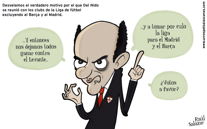 Hoy va de fútbol, y es que acabamos de descubrir el retorcido plan de Jose María del Nido para reventarle la liga al Madrid y al Barcelona. ¿Recuerdan cuando convocó aquella reunión con la mayoría de clubes de la Liga menos los dos equipos mimados? Pues no, no era para discutir sobre los derechos de la televisión, como se había dicho… ¡Me juego lo que quieras a que trazaron un plan para que el Levante gane la liga!