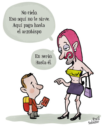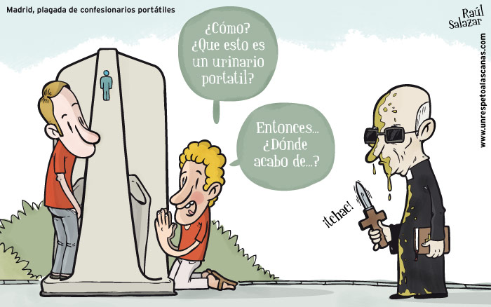 Ojo, los personajes retratados en esta viñeta son ficticios. Cualquier parecido a la realidad es pura coincidencia. En realidad ellos no mean en los urinarios, lo hacen en las fuentes. [«La sangre de Cristo» Don Simón]