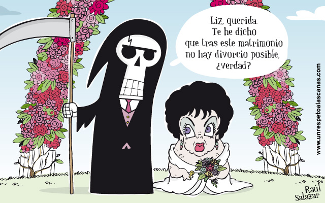 Además he querido en esta viñeta hacer el primer crossover del blog, lo cual me hace mucha ilusión. La muerte que acompaña a Liz es la enigmática y peculiar Parca creada por el talentoso Aitor I. Eraña en R.I.P., sus geniales tiras inspiradas en un cementerio con más marcha de lo normal. No os lo perdáis.