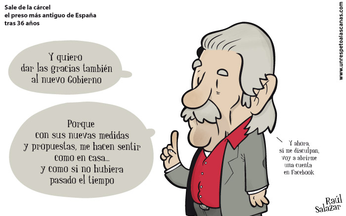 Miguel Montes Neiro, también conocido con honores como «El preso más antiguo de España», ya está en la calle, o lo que es lo mismo, ha cambiado el uniforme de preso por el uniforme de ciudadano. [Noticia] Pronto lo veremos de gira por las cadenas de televisión y se rumorea incluso que su historia puede acabar en la gran pantalla. En fin, que algún dinerillo se sacará el hombre, porque de no ser así, con lo chunga que está la cosa ahí fuera, no me extrañaría que dentro de unos meses echase de menos el menú de la cantina penitenciaria.
